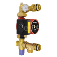 Zestaw pompowo-mieszający z by-pasem. Kontrola wartości zadanej w zakresie 20-50 st.C. Pompa obiegowa UPS 15/40-130 mm, zawór z termostatyczny, odpowietrznik, zawór zwrotny i termometr zintegrowany