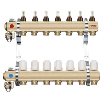 Rozdzielacz do ogrzewania podłogowego FERRO RZP11S 11-obieg. mosiądz gw 1'' x gz 3/4'' + przepływomierz + termostat