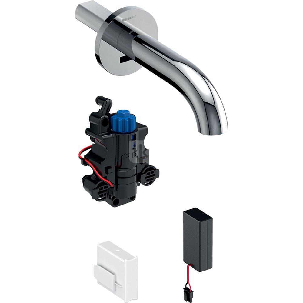 Bateria umywalkowa Geberit Piave, ścienna, zasilanie bateryjne, do podtynkowej skrzynki funkcyjnej, z mieszaczem termostatycznym, L=22cm, chrom