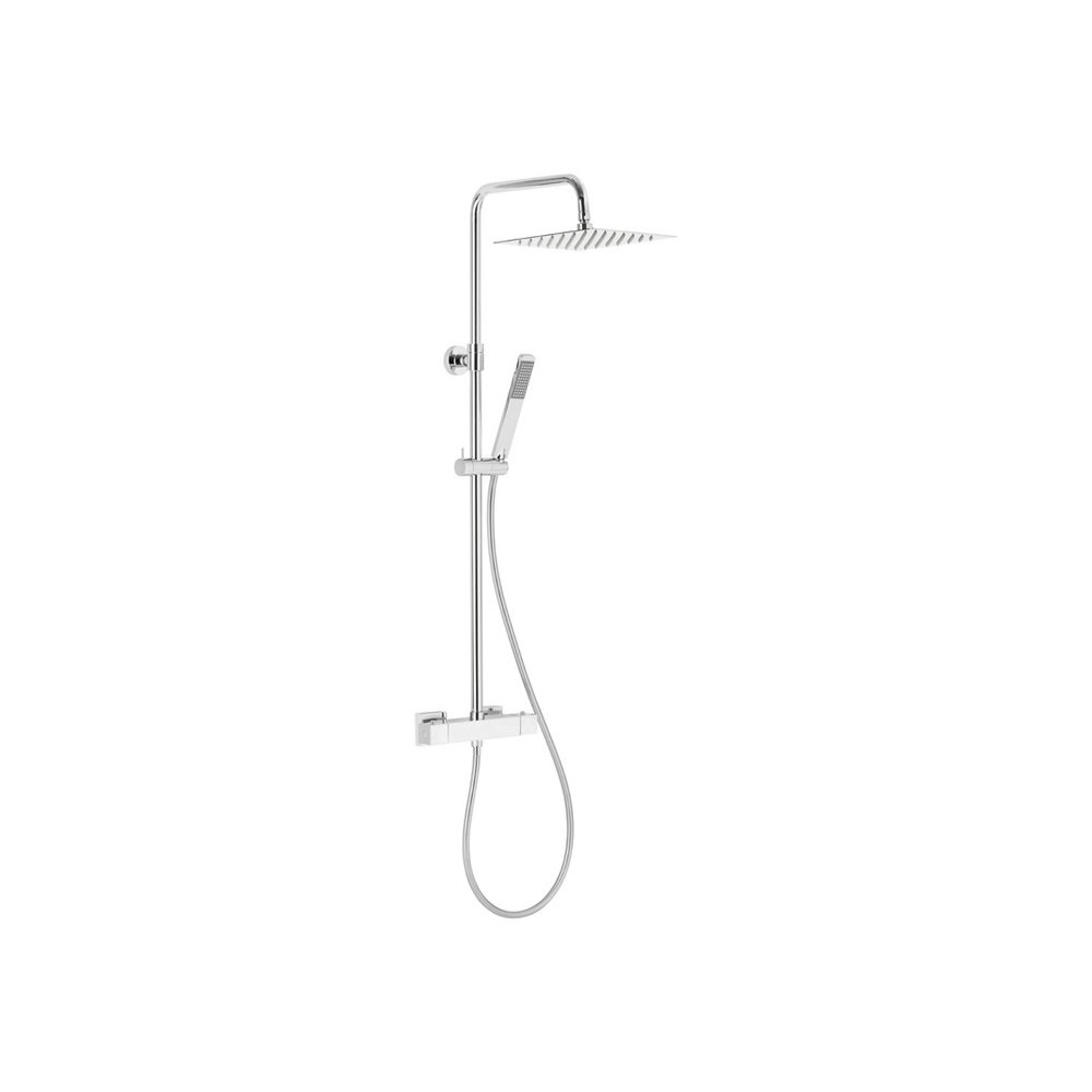 Projekt całości produktu jest spójny – kwadratowy dysk deszczowni idealnie komponuje się z kubicznym kształtem baterii termostatycznej. Co ważne, kształt uchwytów to nie tylko wygląd, to również ergonomia: mamy pewność, że nie wyślizgnie się z mokrej dłoni. Zintegrowany przełącznik natrysku jest wyposażony w blokadę, aby komfortowo korzystać z wybranego trybu – rączki natrysku lub dysku deszczowni.