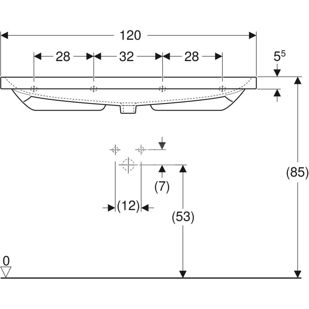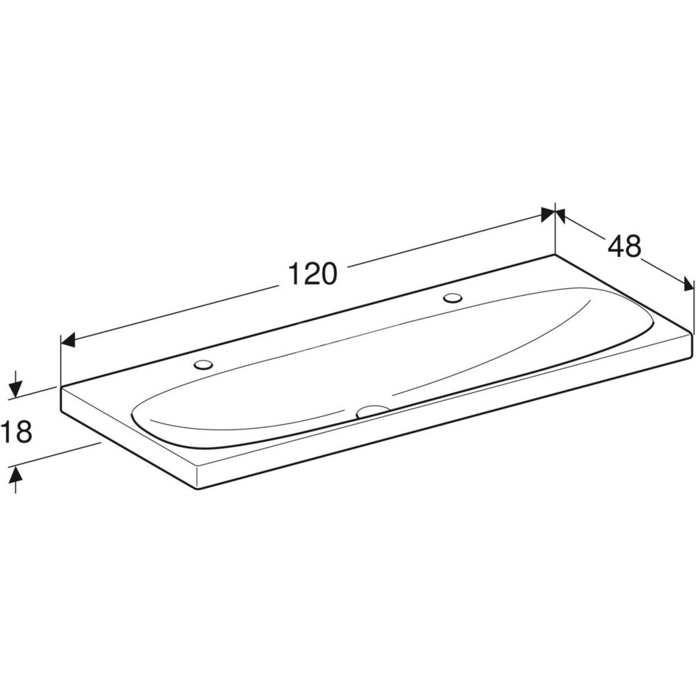 Umywalka GEBERIT Acanto 2-stanowiskowa prostokątna, biała, 1200mm, otwór na baterię z lewej i prawy, bez odpływu przelewowego, półka od ściany