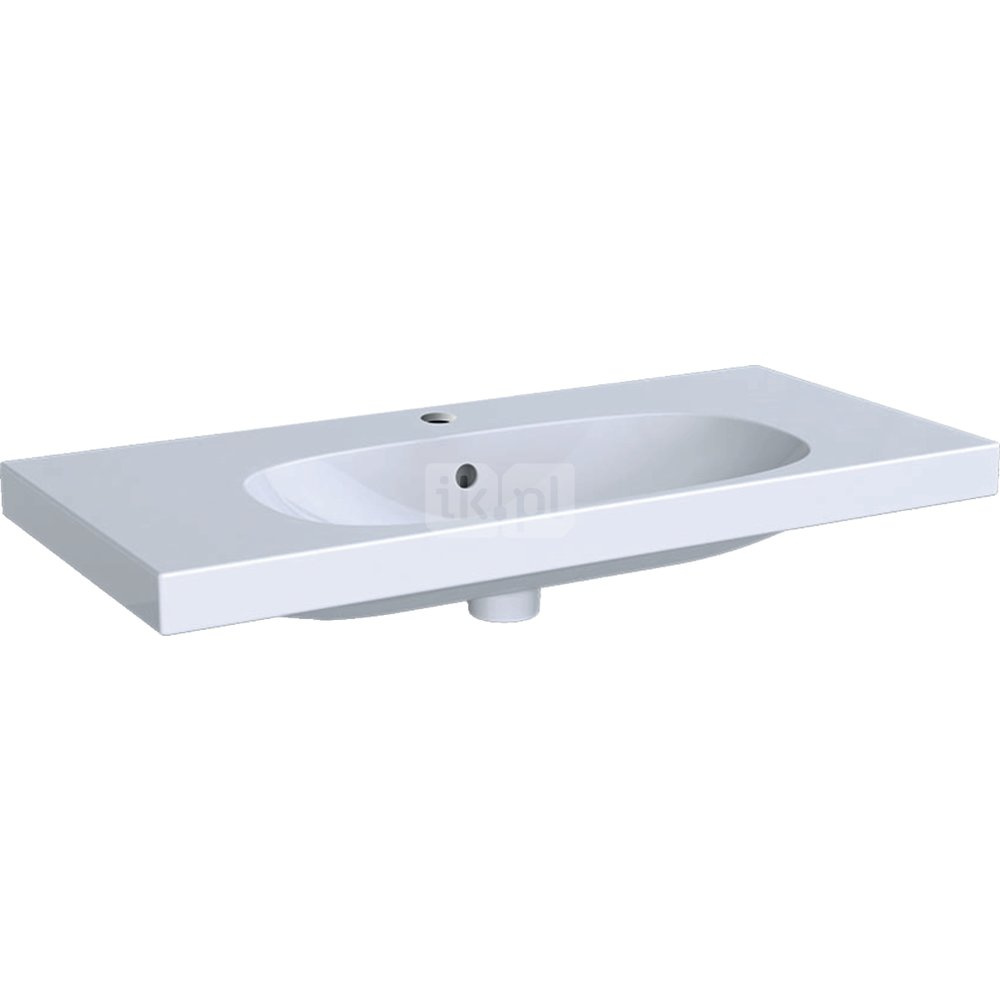 Umywalka GEBERIT Acanto prostokątna, biała, 900mm, otwór na baterię na środku, z odpływem przelewowym, półki z obu stron