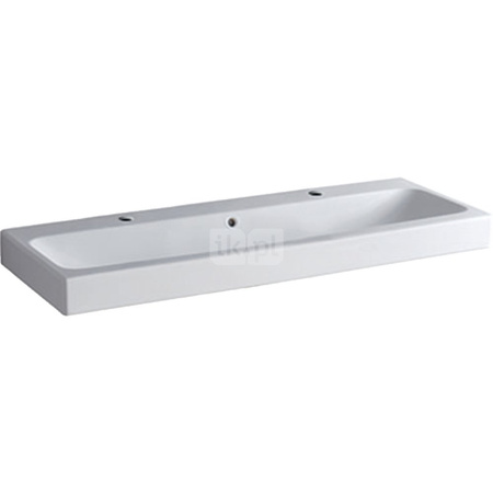 Umywalka GEBERIT iCon 2-stanowiskowa prostokątna, biała, 1200mm, otwór na baterię na środku, z odpływem przelewowym, półka od ściany