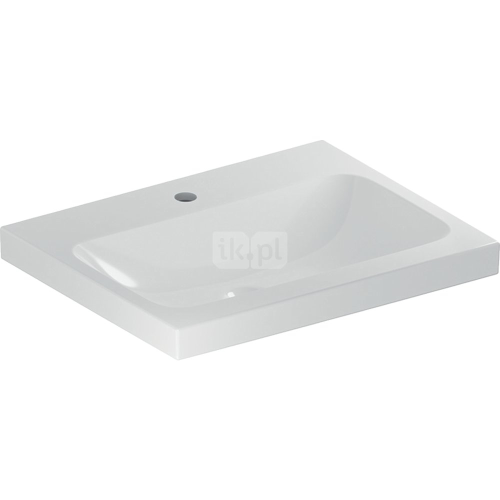 Umywalka GEBERIT iCon Light prostokątna, biała, 600mm, otwór na baterię na środku, stawiana na blat, bez odpływu przelewowego, półka od ściany
