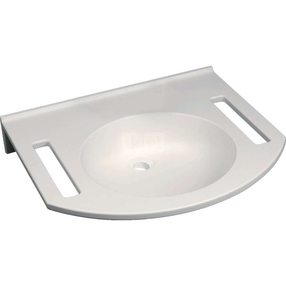 Umywalka GEBERIT Publica okrągła, biała, 600mm, bez otworu na baterię, bez odpływu przelewowego, półka od ściany + wycięcia na ręczniki