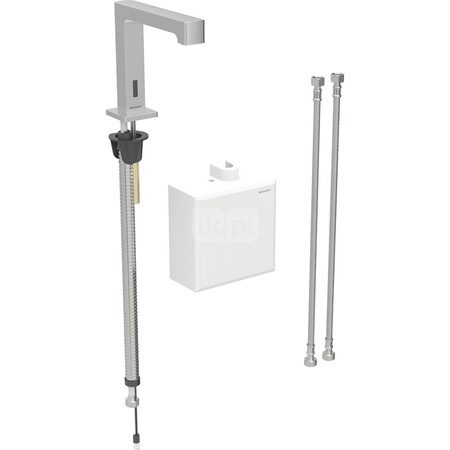 Bateria umywalkowa Geberit Brenta, stojąca, zasilanie bateryjne, z natynkową skrzynką funkcyjną, z mieszaczem, stal nierdzewna