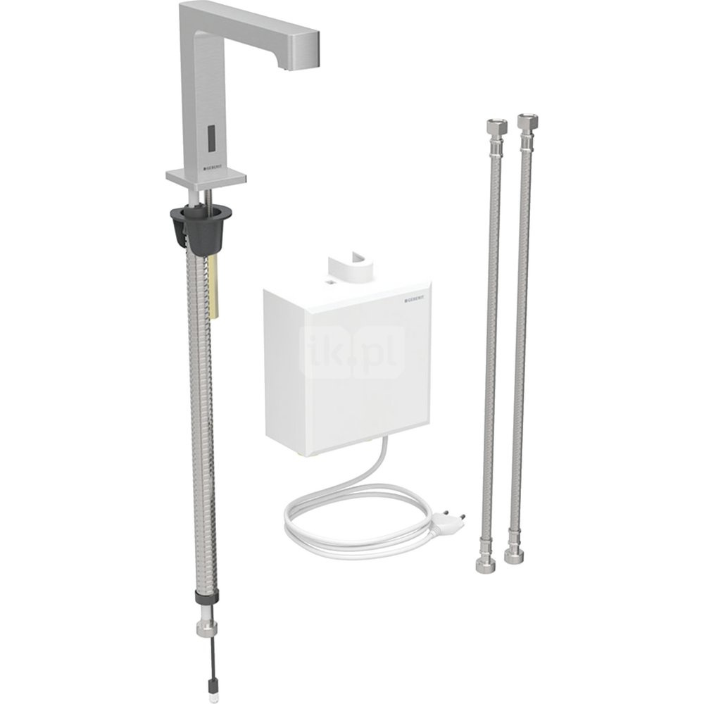 Bateria umywalkowa Geberit Brenta, stojąca, zasilanie sieciowe, z natynkową skrzynką funkcyjną, z mieszaczem termostatycznym, stal nierdzewna