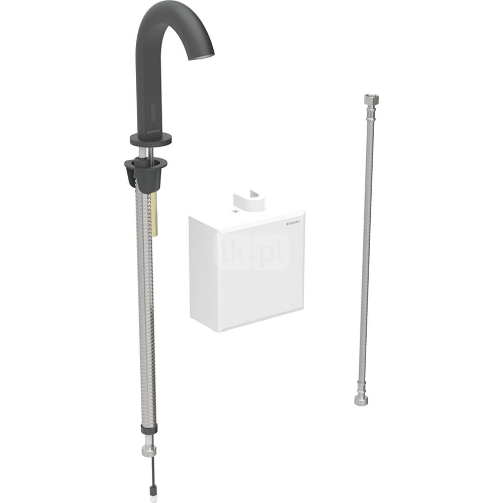 Bateria umywalkowa Geberit Piave, stojąca, zasilanie generatorowe, z natynkową skrzynką funkcyjną, bez mieszacza, czarny mat