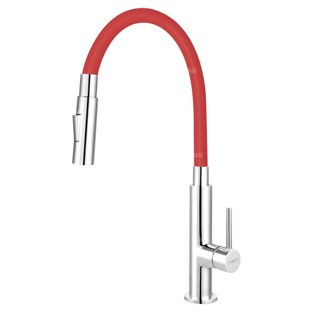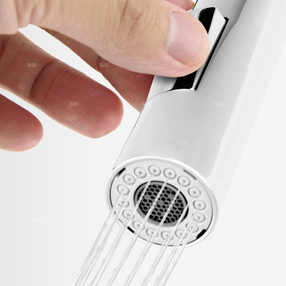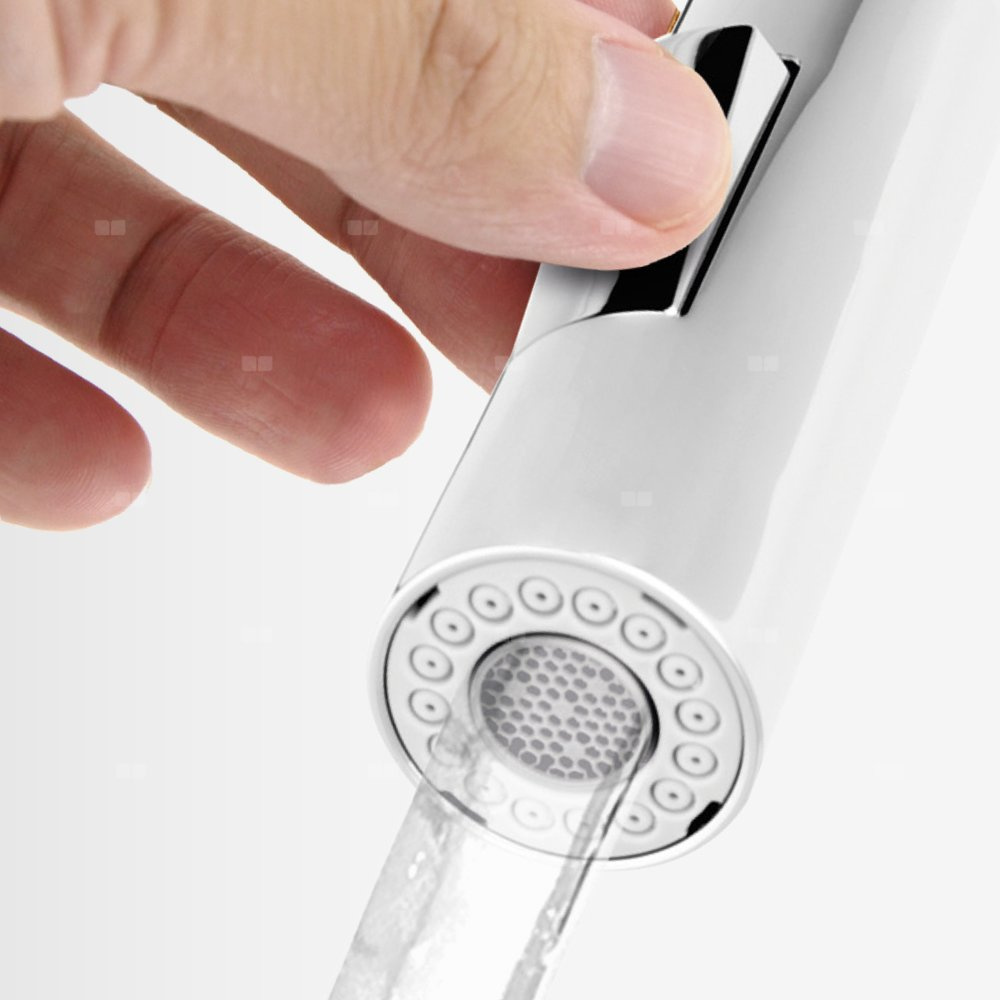 Wygodny w użyciu przełącznik pozwala na szybką zmianę strumienia. Po zamknięciu wypływu automatycznie wraca do wyjściowej pozycji. Skupiony jednolity strumień ze środka wylewki pozwala na precyzyjne napełnianie naczyń. Strumień rozproszony poprzez dysze wokół
