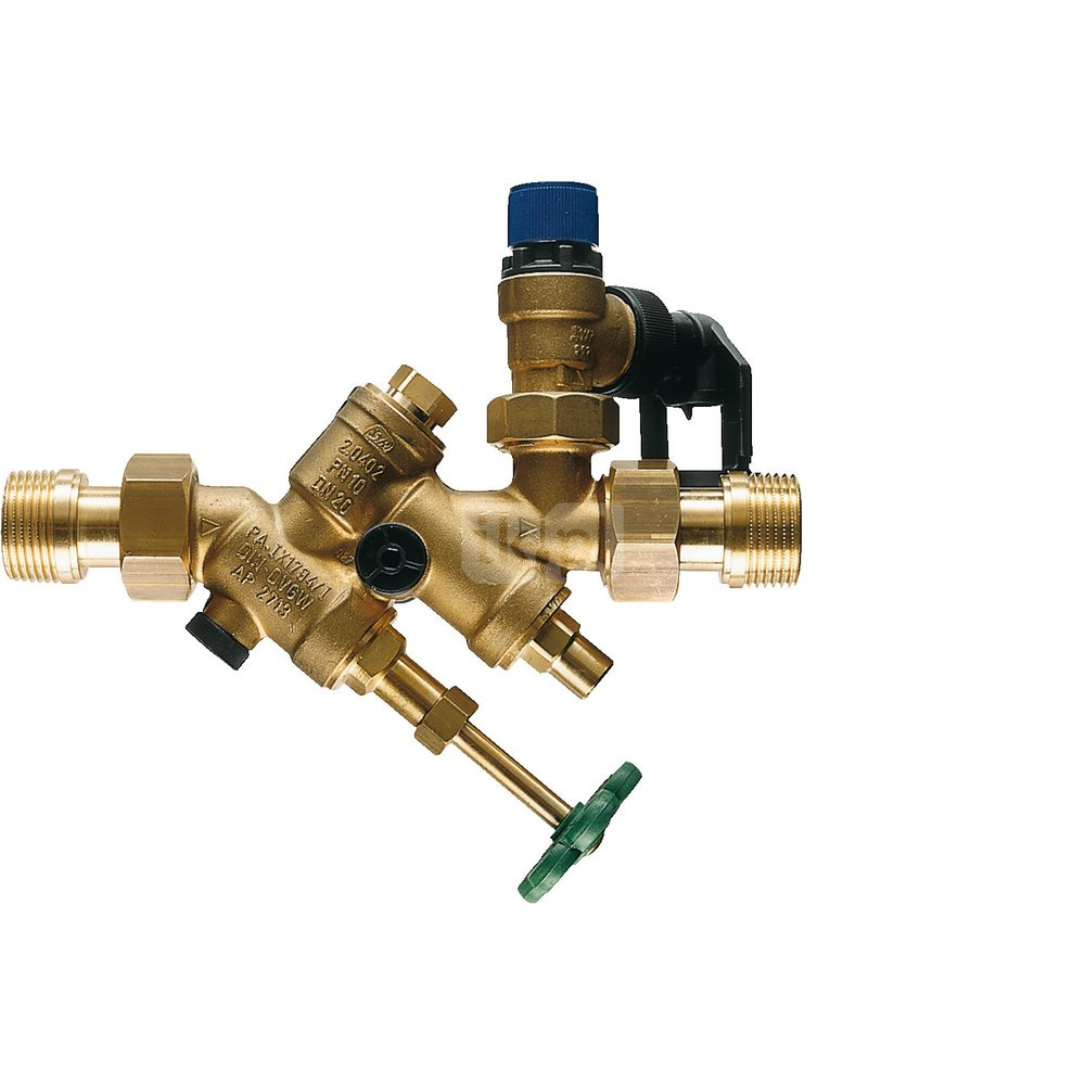 • Do zakresu dostawy należy zawór odcinający, zawór zwrotny z mechanizmem kontrolnym, przyłącze manometru, membranowy zawór bezpieczeństwa i lejek odpływowy.