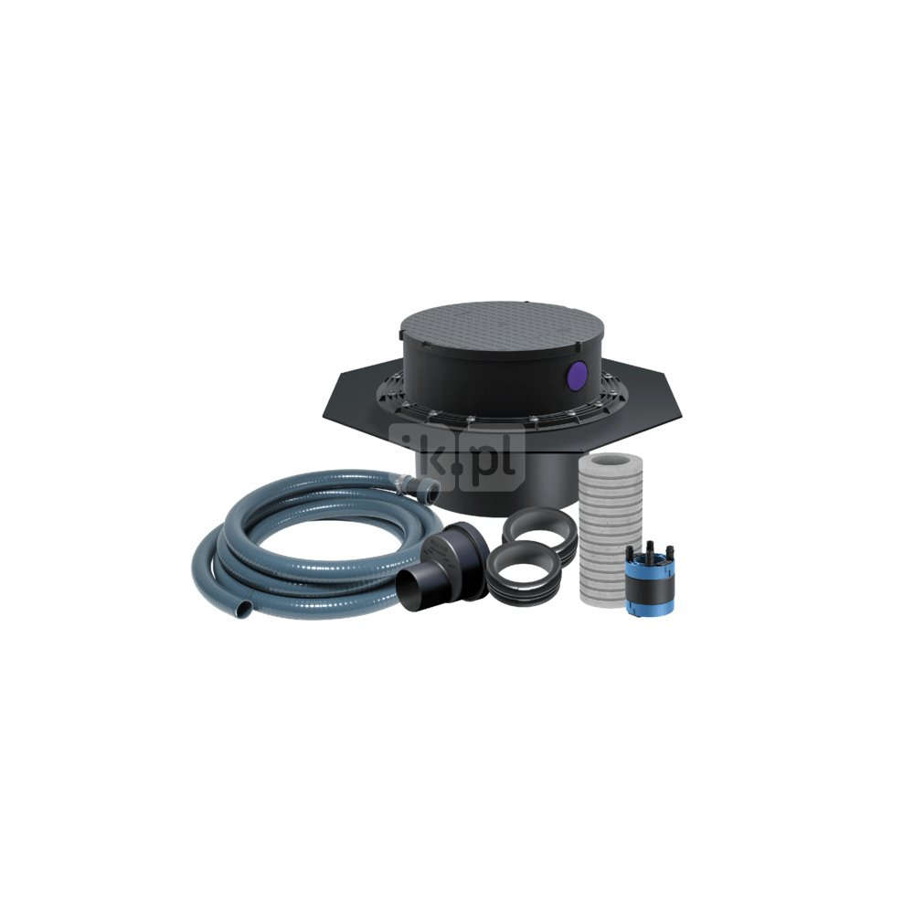 Wodoszczelny zestaw instalacyjny dla firm budowlanych do przepompowni Aqualift Compact i przepompowni hybrydowych Ecolift firmy KESSEL w połączeniu z wodoszczelnymi płytami podłogowymi, składający się z przedłużki, środkowego kołnierza wodoszczelnego, zestawu przewodu ciśnieniowego, kołnierza uszczelniającego, rury okładzinowej z uszczelnieniem okrężnym do przewodu giętkiego ciśnieniowego oraz przejściówki.