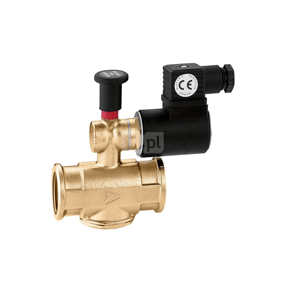 Zawór elektromagnetyczny do gazu, normalnie otwarty, z ręcznym odblokowaniem Przyłącze: Rp 1" (EN 10226-1) GW. Maksymalne ciśnienie pracy: 500 mbar. Zasilanie elektryczne: 230 V (AC). Stopień ochrony: IP 65.
