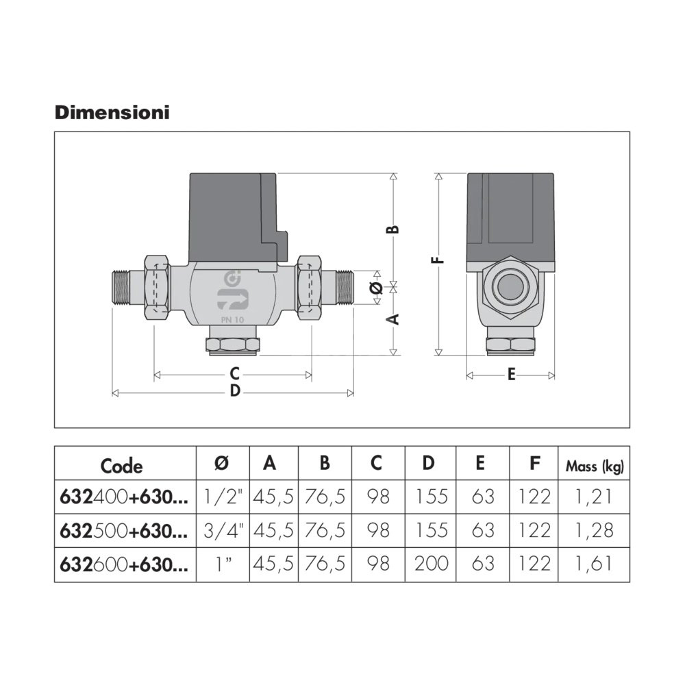 Dwudrożny zawór strefowy, tłokowy Przyłącze: R 1" (EN 10226-1) GZ. Maksymalne ciśnienie pracy: 10 bar. Zakres temperatury medium: -5–95 °C. △p max.: 1 bar. Kv przelot: 6,38 m³/h.