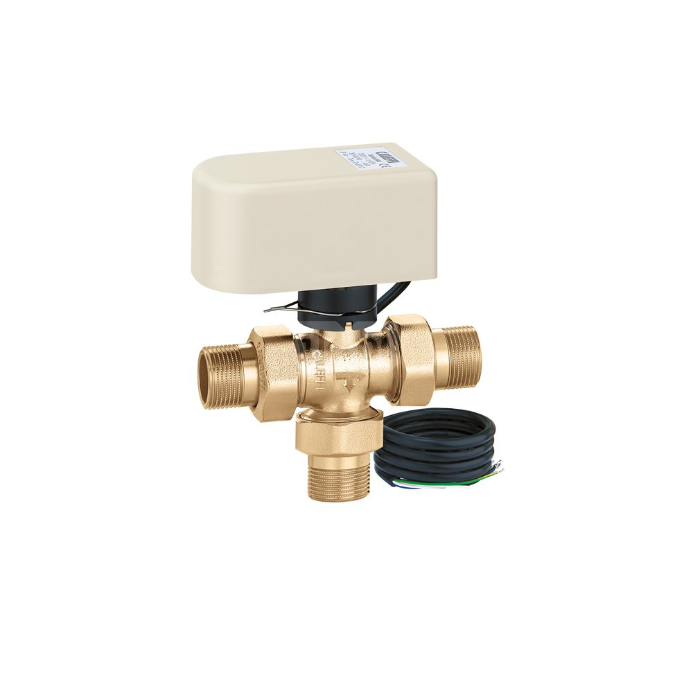 Trójdrożny kulowy zawór strefowy z napędem, wersja z obejściem Z mikroprzełącznikiem pomocniczym W zestawie z siłownikiem ze sterowaniem 3-punktowym Przyłącze: G 3/4" A (ISO 228-1) GZ. Maksymalne ciśnienie pracy: 10 bar. Zakres temperatury medium: -5–110 °C. Zakres temperatury otoczenia: 0–55 °C. Zasilanie elektryczne: 230 V (AC). Pobór mocy: 4 VA. Stopień ochrony: IP 44 (w pozycji pionowej), IP 40 (w pozycji poziomej). Długość przewodu zasilająego: 1 m. Styk mikroprzełącznika pomocniczego (230 V): 0,8 A. △p max.: 10 bar. Kv przelot: 10,3 m³/h. Kv obejście: 1,8 m³/h. Czas zadziałania: 40 s (obrót 90°).