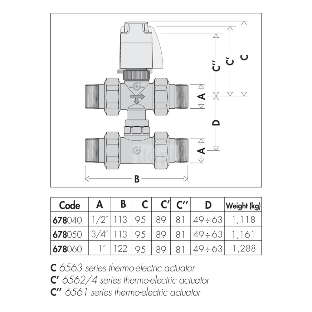 Trójdrożny zawór strefowy z obejściem współpracujący z siłownikami termoelektrycznymi serii 6563, 6561, 6562 i 6564 1"