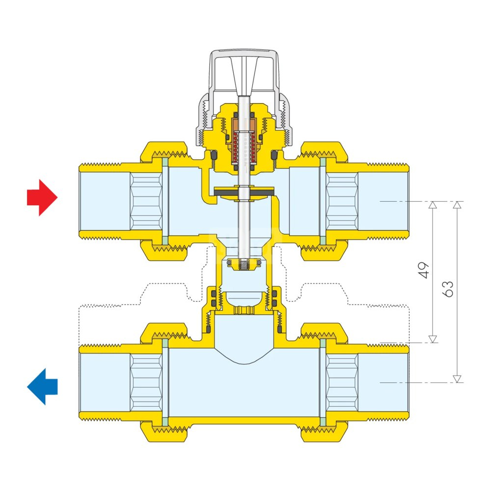 Trójdrożny zawór strefowy z trójnikiem obejściowym. Przystosowany do siłowników termoelektrycznych serii 6563, 6561, 6562 i 6564. Regulowana odległość środkowych otworów wylotowych od 49 do 63 mm. Trójnik z dyszą U6. Przyłącze: G 1/2" A (ISO 228-1) GZ. Maksymalne ciśnienie pracy: 10 bar. Zakres temperatury medium: 0–95 °C. △p max.: 1,2 bar. Kv przelot: 3,7 m³/h. Kv obejście: 1,0 m³/h.