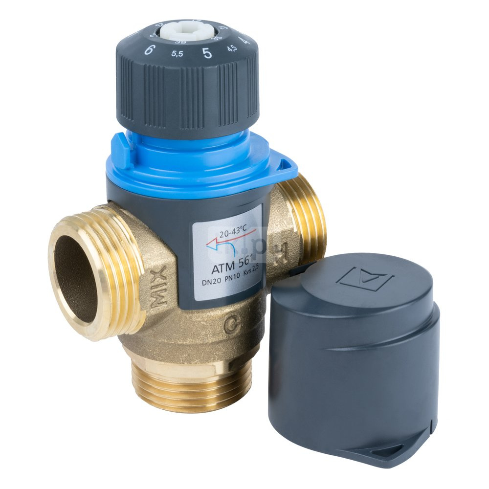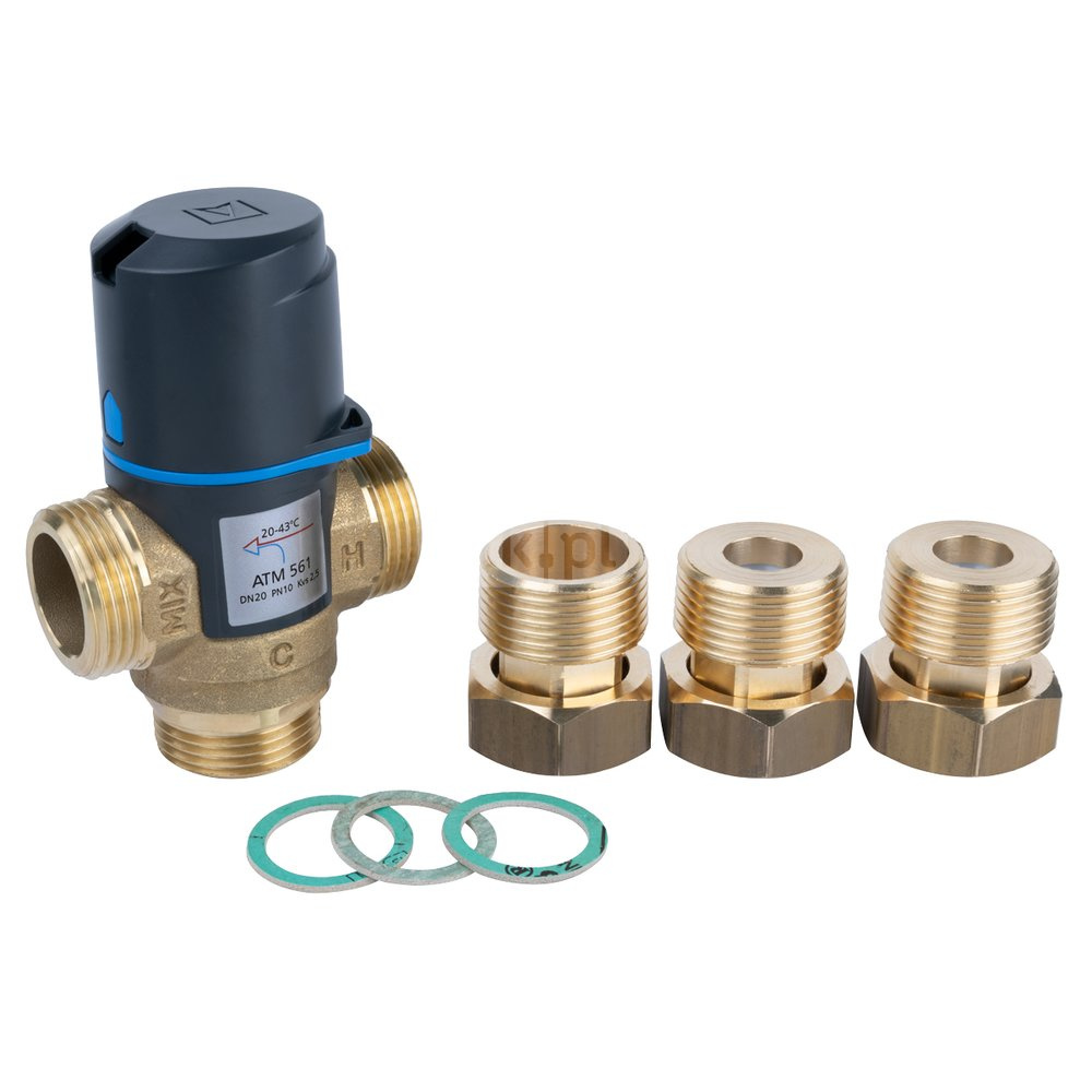 Zawór regulacyjny termostatyczny do wody ciepłej AFRISO ATM 561 ze śrubunkami mosiądz GZ 1'', DN 20, zakres temp. 20-43'C, Kvs 2.5 m3/h, maksymalna temperatura 90'C, maksymane ciśnienie 10 bar