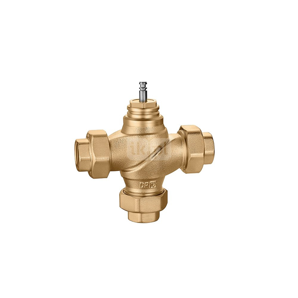 Trójdrożny zawór regulacyjny, gwintowany Charakterystyka stałoprocentowa. Przyłącze: Rp 1/2" (EN 10226-1) GW, złączka. Maksymalne ciśnienie pracy: 16 bar. Zakres temperatury medium: 0–100 °C. PN (Ciśnienie nominalne): PN 16. DN: DN 15 (korpus). Kv: 4 m³/h. Materiał: stop mosiądzu odporny na odcynkowanie.