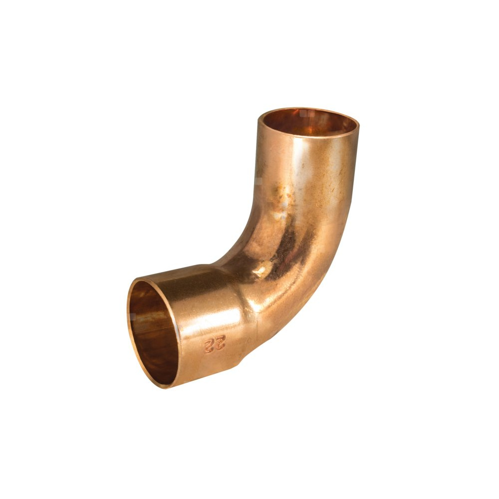 Łuk nyplowy 90° z miedzi, do wody posiada przyłącze zaprasowywane z oringiem EPDM i przyłącze nyplowe. Wystarczy przyłożyć nacisk za pomocą narzędzia do zaciskania, aby zacisnąć pierścień uszczelniający na rurze, zapewniając czyste, wodoszczelne uszczelnienie w ciągu kilku sekund bez płomienia, lutu lub topnika. Nadaje się do instalacji wody pitnej, ciepłej i zimnej wody, wody lodowej, sprężonego powietrza i próżni. Złączka umożliwia zmianę kierunku rurociągu o 90 stopni pomiędzy połączeniem zaprasowywanym a połączeniem, które można lutować lub zaprasowywać.