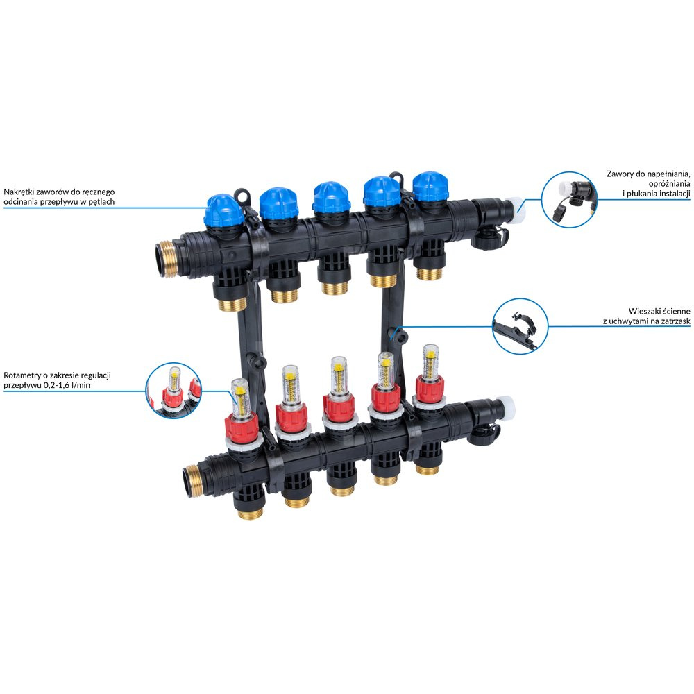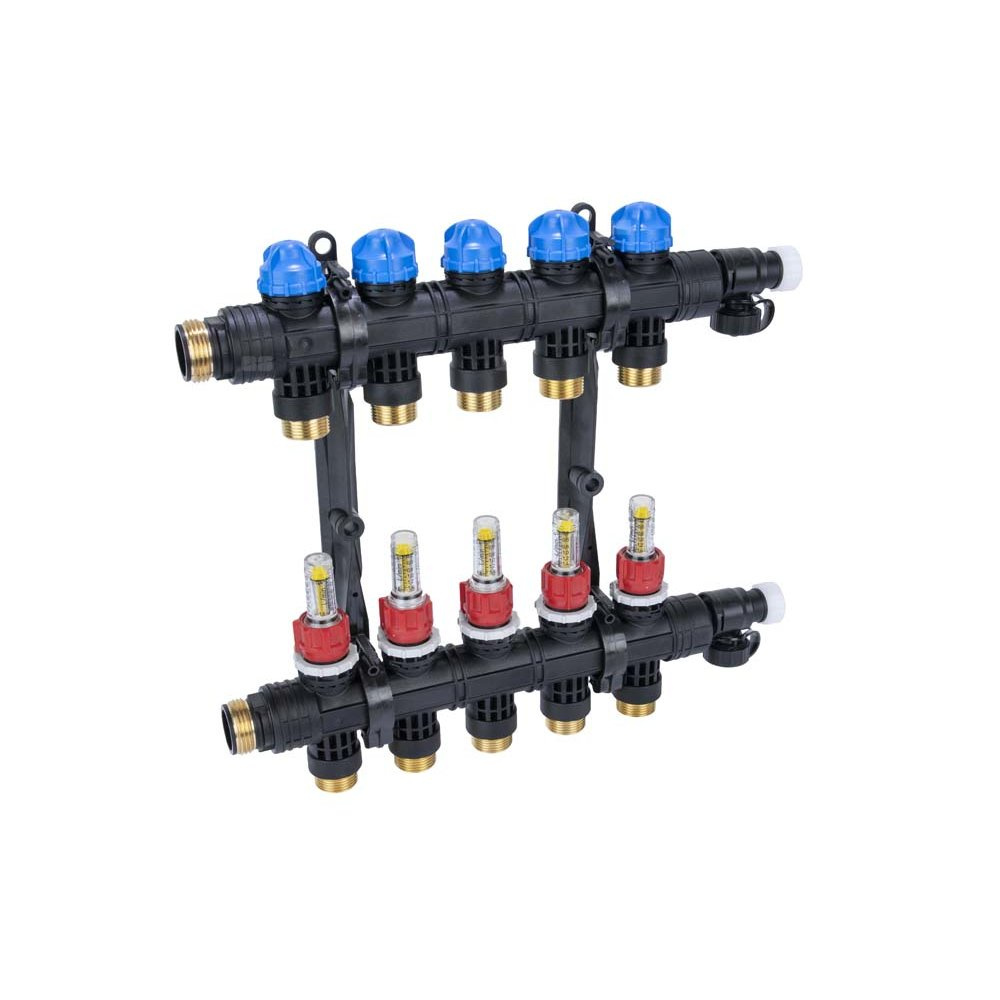 Rozdzielacz do ogrzewania podłogowego AFRISO ProCalida EF1 K 5-obieg. poliamid GZ 1'' x euroconus 3/4'' + przepływomierz + zawór napełn/spust