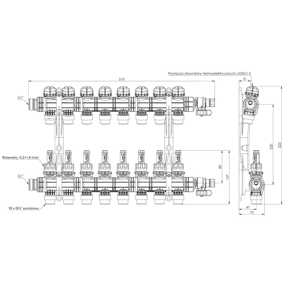 - przyłącza siłowników termoelektrycznych: M30x1,5