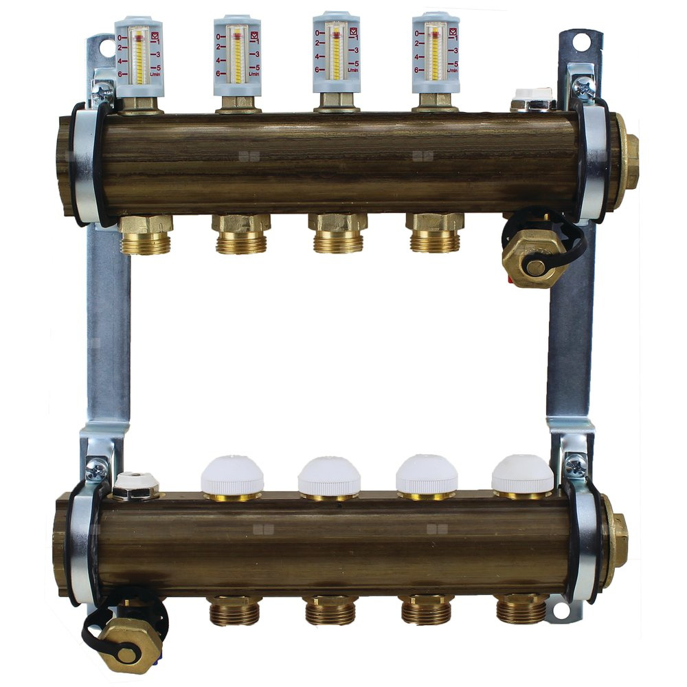 Rozdzielacz do ogrzewania podłogowego HERZ 5-obieg. mosiądz GW 1'' x GZ 3/4'' + przepływomierz + zawór napełn/spust + odpowietrznik
