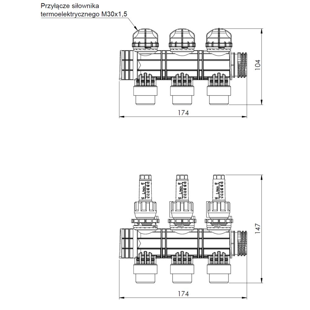 Na zaworach odcinających na belce powrotnej można zamontować siłowniki termoelektryczne (np. TSA-01) i podłączyć je do systemu sterowania strefowego (np. FloorControl, CosiTherm), co pozwoli ustawić różne temperatury w każdej ze stref.