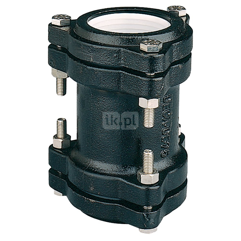 Złączka równoprzelotowa z żeliwa Do rur polietylenowych. Śruby ze stali nierdzewnej. Przyłącze: Ø 125. Maksymalne ciśnienie pracy: 10 bar. Zakres temperatury medium: 0–40 °C. Materiał: żeliwo.