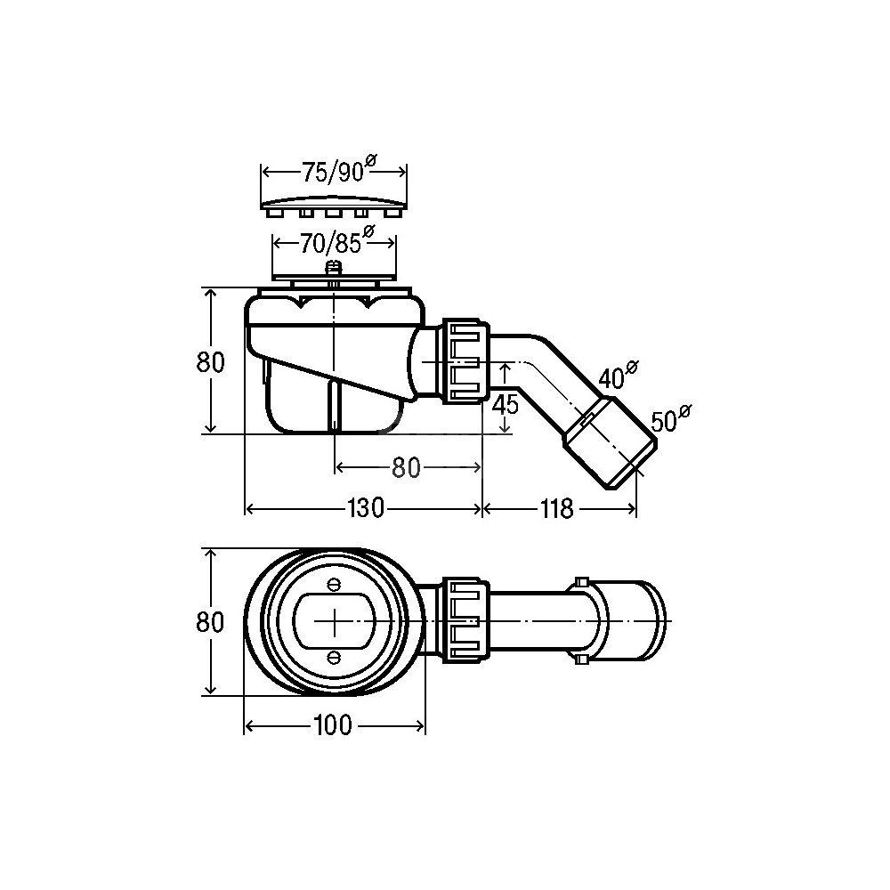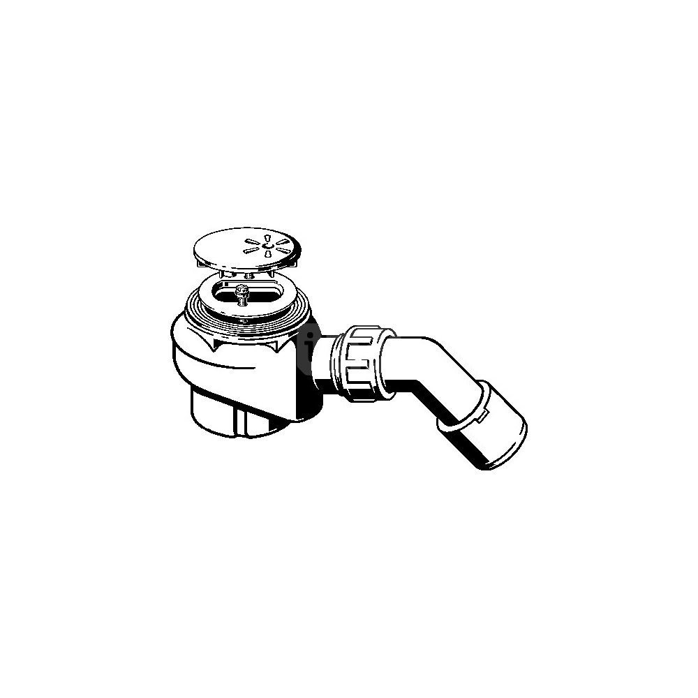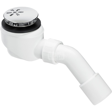 Domoplex-odpływ. Wyposażenie: Kołpak chromowany, syfon wyjmowalny, łuk odpływowy 45°. Dane techniczne: wysokość zamknięcia wodnego 50 mm, wydajność odpływu przy wysokości spiętrzenia 120 mm 0,73 l/s, wg PN-EN 274, nr wzoru 6928PL, nr kat. 703 257,