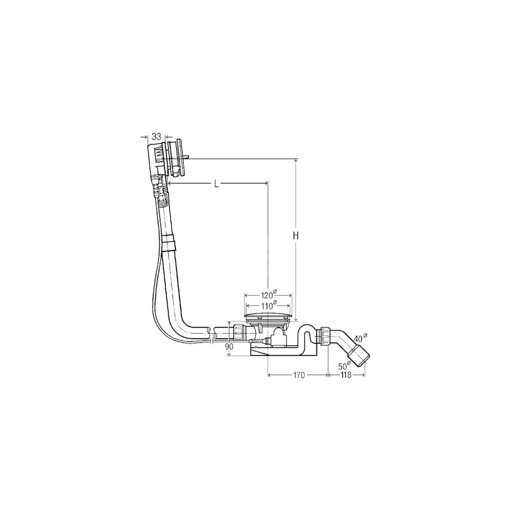 Rotaplex Trio-komplet odpływowo-przelewowy Visign RT3 nr wzoru 6141.61 DN: 40/50 długość cięgna Bowdena: 725 L: 150–400 H: 180–430 wanna z odpływem pośrodku do wanien z otworem odpływowym fi 90