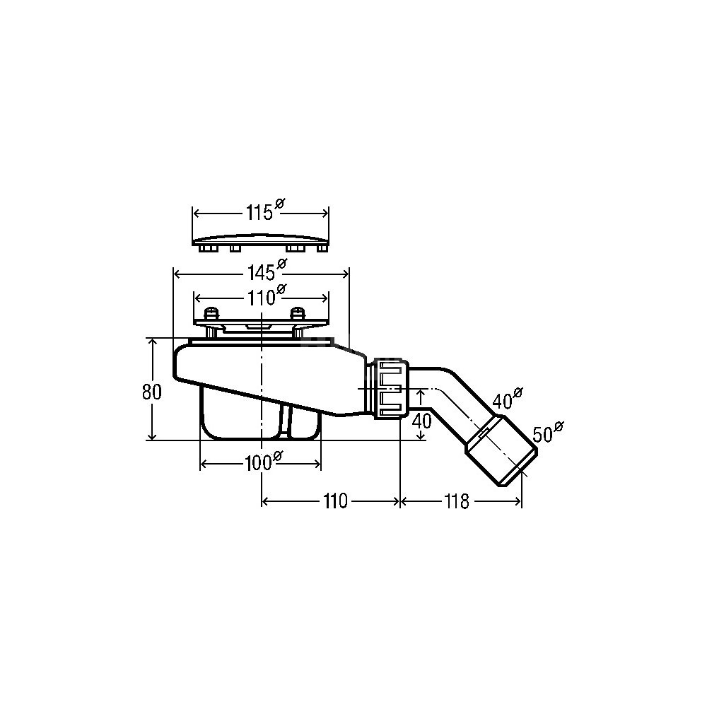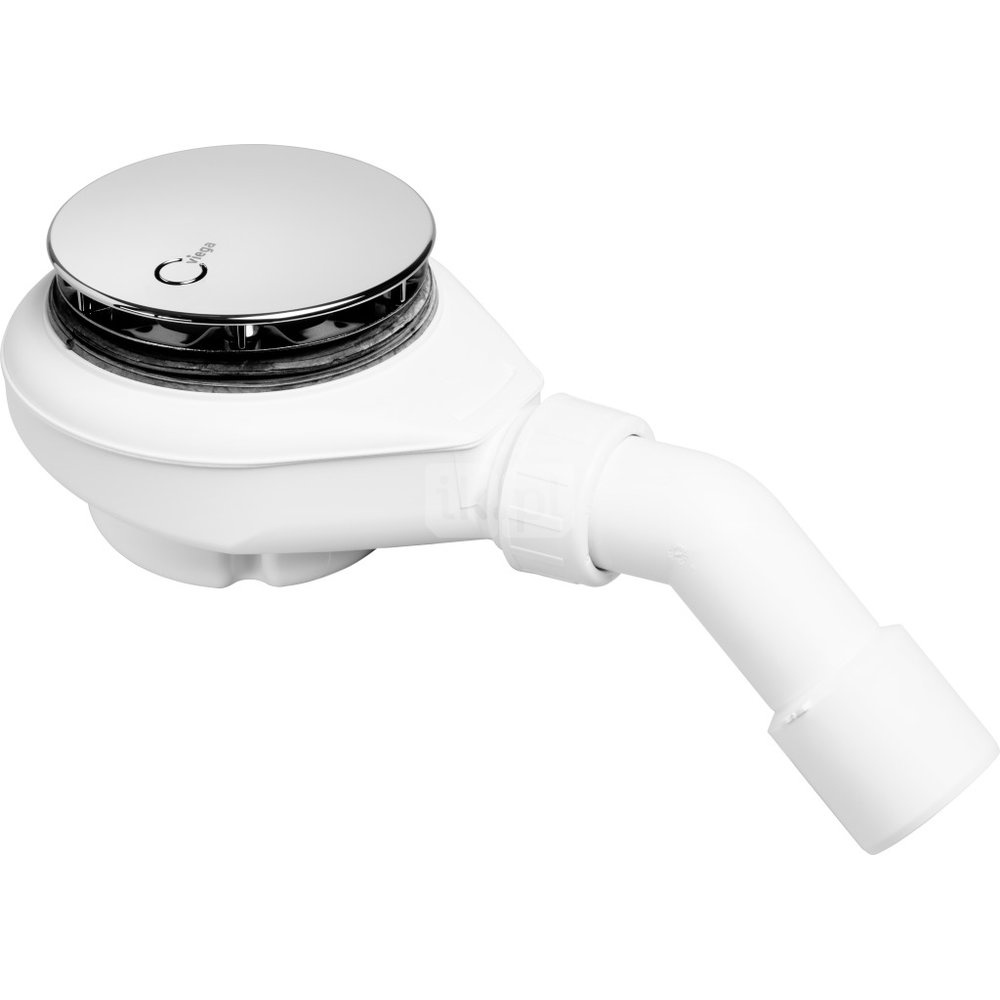 Tempoplex-odpływ. Wyposażenie: Kołpak chromowany, syfon wyjmowalny, łuk odpływowy 45°. Dane techniczne: wysokość zamknięcia wodnego 50 mm, wydajność odpływu przy wysokości spiętrzenia 15 mm 0,64 l/s, wg PN-EN 274, nr wzoru 6961PL, nr kat. 703 394,