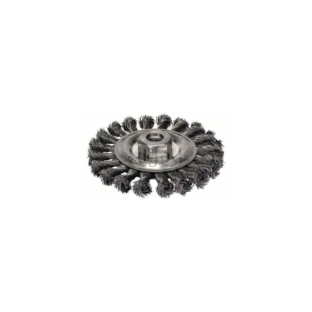 Tekst produktu, osprzęt szary Szczotka tarczowa – drut pleciony Optymalne narzędzie do czyszczenia spawów. Do ciężkich prac związanych z czyszczeniem z dużą prędkością obwodową mniejszych powierzchni metalowych, rowków lub krawędzi, jak np. usuwanie silnej korozji, usuwanie lakieru, żużlu, zadziorów i zgorzeliny. Do wszystkich szlifierek kątowych z gwintem M 14 oraz szlifierki prostej GGS 6 S Professional