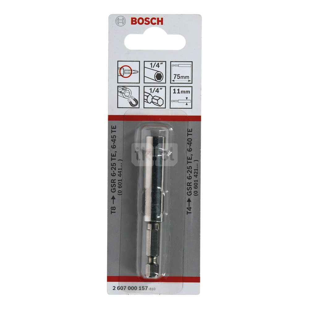 | Tekst produktu, osprzęt szary | Uchwyty uniwersalne z magnesem trwałym i pierścieniem rozprężnym Z ogranicznikami głębokości T8 (2 607 002 585) lub T4 (2 607 000 156) do końcówek wkręcających z chwytem zewnętrznym sześciokątnym 1/4", zgodnym z ISO 1173 C6.3 |