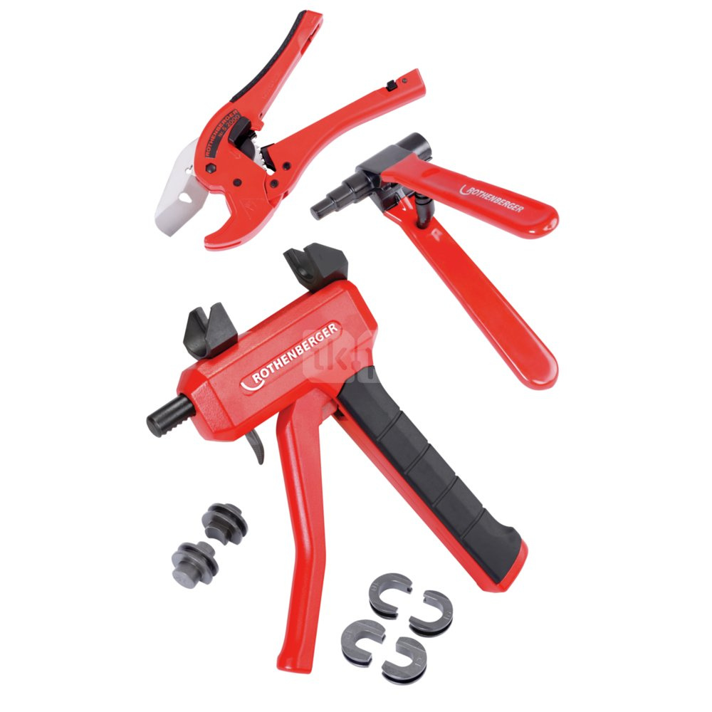 Wygoda: zestaw 3 w 1 składający się z nożyc do cięcia tworzyw sztucznych ROCUT TC 42, ekspandera i ręcznej zaciskarki osiowej - wszechstronny pakiet do bezproblemowego łaczenia rur i kształtek.