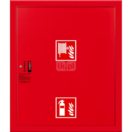 - szafka hydrantowa STANDARD wykonana z blachy czarnej malowanej farbą proszkową poliestrową fasadową typ Facade w kolorze czerwonym (RAL 3000) lub białym (RAL 9003), drzwi pełne; dzięki zastosowaniu zawiasu krytego drzwi szafki można otworzyć o 180°