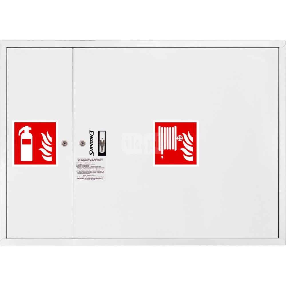 - szafka hydrantowa STANDARD wykonana z blachy czarnej malowanej farbą proszkową poliestrową fasadową typ Facade w kolorze czerwonym (RAL 3000) lub białym (RAL 9003), drzwi pełne; drzwi szafki można otworzyć o 180°