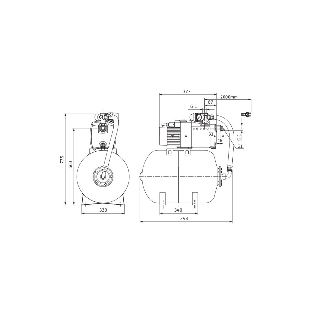 Fabrycznie zamontowana i okablowana jednostka, złożona z wielostopniowej, poziomej pompy wirowej w wersji dławnicowej, samozasysająca, z silnikiem z bezpośrednim przyłączem kołnierzowym (uszczelnienie przepustu wałowego w postaci niewymagającego konserwacji uszczelnienia mechanicznego) oraz z ciśnieniowym naczyniem przeponowym
