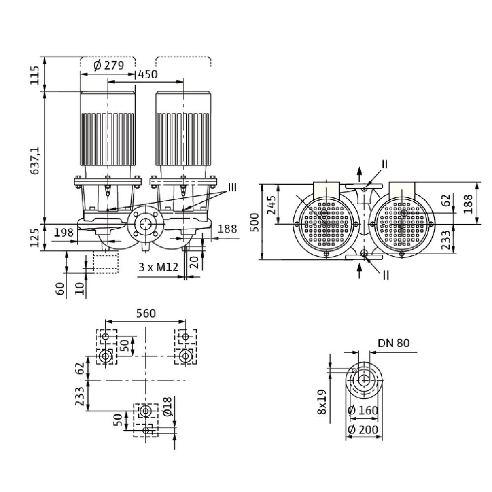 Pompa obiegowa WILO CronoTwin-DL 80/270-5,5/4-IE3 typu in-line z silnikiem znormalizowanym 50 Hz, moc silnika 5.5kW 11.1 A 1450 obr/min, wlot Kołnierz DN 80