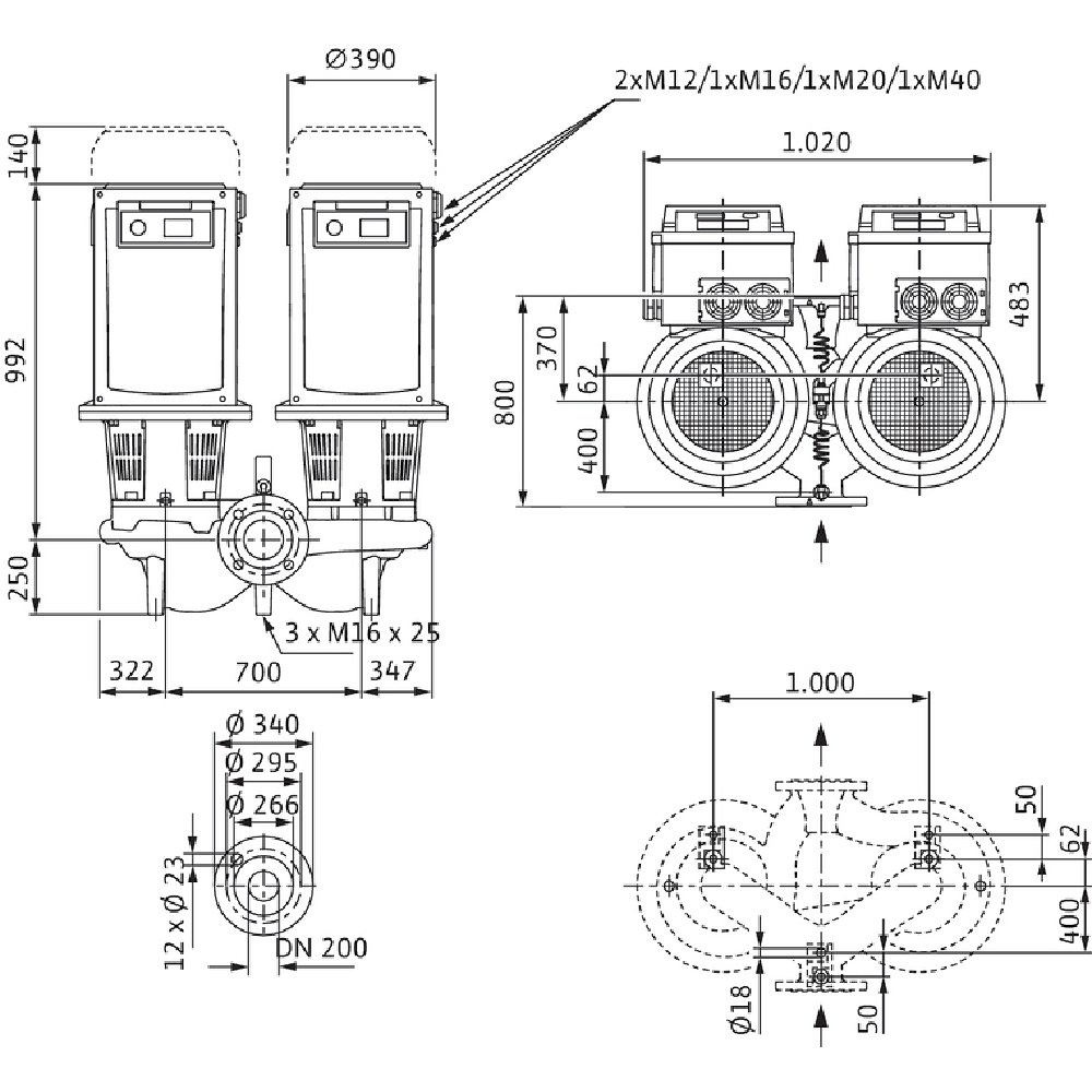 Pompa obiegowa WILO CronoTwin-DL-E 200/250-18,5/4-R1-S1 typu in-line z silnikiem znormalizowanym 50/60 Hz, moc silnika 18.5kW 32.7 A 1450 obr/min, wlot Kołnierz DN 200