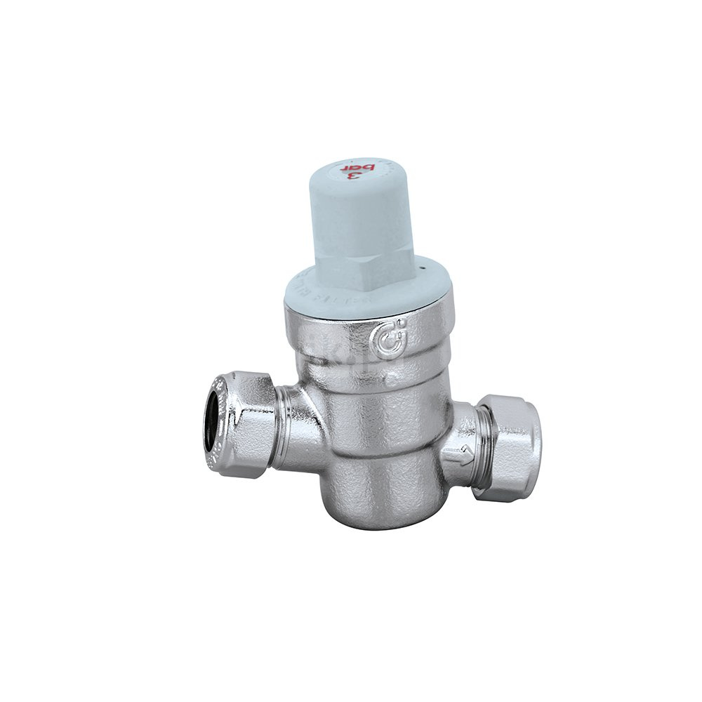 Regulator ciśnienia ze złączkami zaciskowymi – wersja skośna Wkład i filtr wymienny. Przyłącze: Ø 22. Maksymalne ciśnienie wlotowe: 16 bar. Zakres temperatury medium: 2–40 °C. Zakres regulowanego ciśnienia: 1–6 bar. Wykończenie: chromowane. Materiał: stop mosiądzu odporny na odcynkowanie.