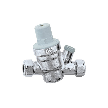 Regulator ciśnienia ze złączkami zaciskowymi – wersja skośna Wkład i filtr wymienny. Przyłącze: Ø 22. Maksymalne ciśnienie wlotowe: 16 bar. Zakres temperatury medium: 2–40 °C. Zakres regulowanego ciśnienia: 1–6 bar. Wykończenie: chromowane. Materiał: stop mosiądzu odporny na odcynkowanie.