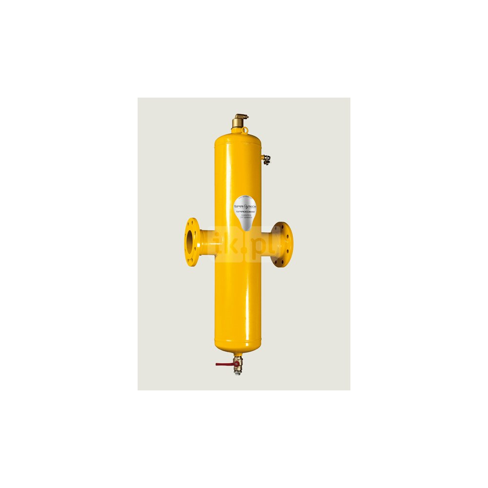 Separator powietrza i zanieczyszczeń SPIROCOMBI stalowy Hi-flow. Jest to urządzenie bezobsługowe, pracujące bez siatek i filtrów, zapewniające ciągłą separację powietrza (i gazów) oraz zanieczyszczeń stałych do najdrobniejszych cząstek, utrzymując instalację w stanie uzdatnienia. SPIROCOMBI wykonywany jest w wersji Hi-flow głównie dla instalacji chłodniczych - duże przepływy czynnika - większe niż w instalacjach ciepłowniczych. Wykonanie ze stali na rurociągi poziome DN50-DN300, połączenia kołnierzowe lub do wspawania.