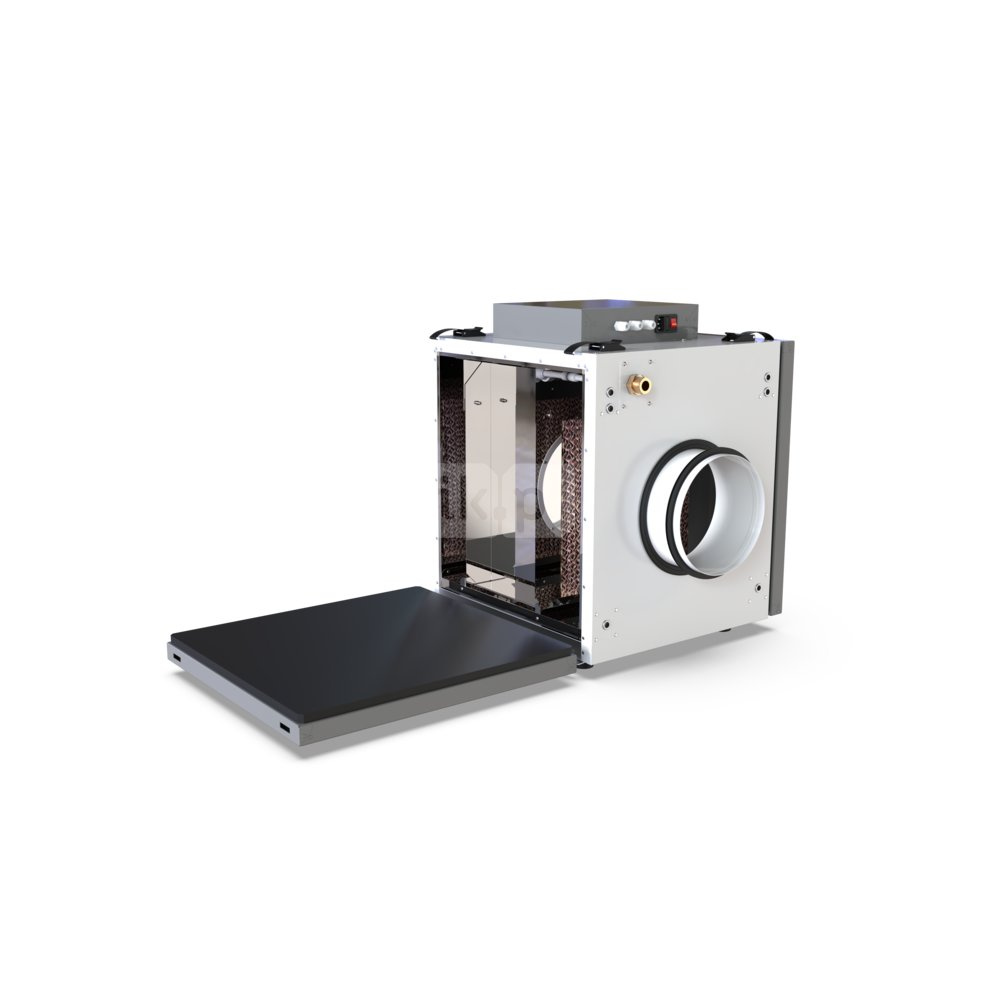 Nawilżacz wyposażony jest w nagrzewnicę wtórną z wysokiej klasy matą ewaporacyjną, zapewniającą najniższy poziom obiegu alergenów w pomieszczeniach. Energooszczędne i samodzielne działanie. Wykonany jest z ocynkowanej wysokogatunkowej stali z króćcami DN200 mm.