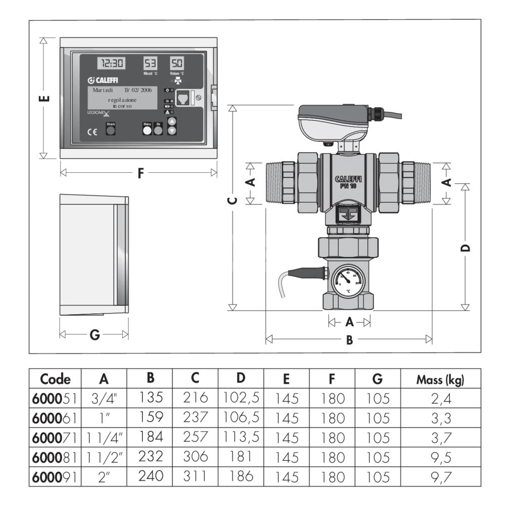 Elektroniczny zawór mieszający z programowalną dezynfekcją termiczną i dezynfekcją kontrolną 230 V. Przyłącza z gwintem zewnętrznym ze złączkami. Z mikroprzełącznikiem pomocniczym Zawiera: -trójdrożny zawór kulowy; -siłownik; -regulator; -czujnik temperatury wody zmieszanej; -czujnik temperatury wody cyrkulacyjnej. Przyłącze: R 1 1/4" (EN 10226-1) GZ, wlot, złączka. Przyłącze: G 1 1/4" (ISO 228-1) GW, wylot. Maksymalne ciśnienie pracy: 10 bar. Zakres temperatury medium: 0–100 °C. Zakres regulacji temperatury: 20–85 °C. Zakres temperatury dezynfekcji: 40–85 °C. Zasilanie elektryczne: 230 V (AC). Pobór mocy: (6,5+6) VA. Stopień ochrony: IP 65. Kv: 21,2 m³/h.