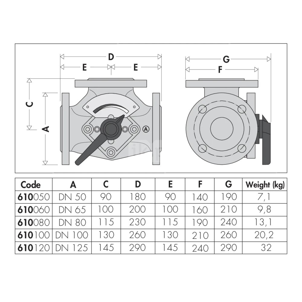 Zawór czterodrogowy mieszający z przepustnicą. Przyłącza kołnierzowe Ustawienie fabryczne: zasilanie ze źródła ciepła z prawej strony. Do stosowania w ciężkich warunkach. Przyłącze: DN 125 (EN 1092-1) PN 6. Maksymalne ciśnienie pracy: 6 bar. Zakres temperatury medium: 2–110 °C. PN (Ciśnienie nominalne): PN 6. Kv: 410 m³/h.