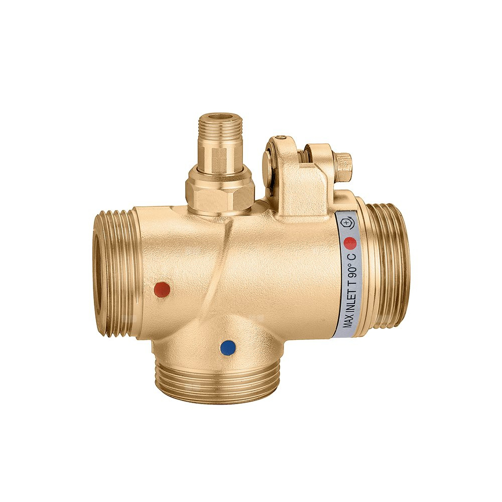 Regulowany termostatyczny zawór mieszający do systemów scentralizowanych. Z przyłączem do cyrkulacji. Przyłącze: G 1 1/4" A (ISO 228-1) GZ. Maksymalne ciśnienie pracy: 10 bar. Zakres temperatury medium: 2–90 °C. Zakres regulacji temperatury: 30–65 °C. DN: DN 20 (korpus). Kv: 2,5 m³/h. Materiał: mosiądz.
