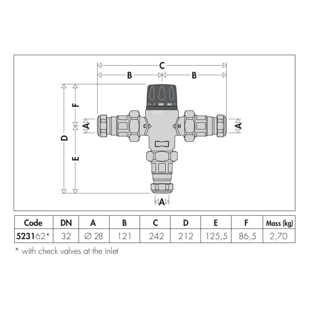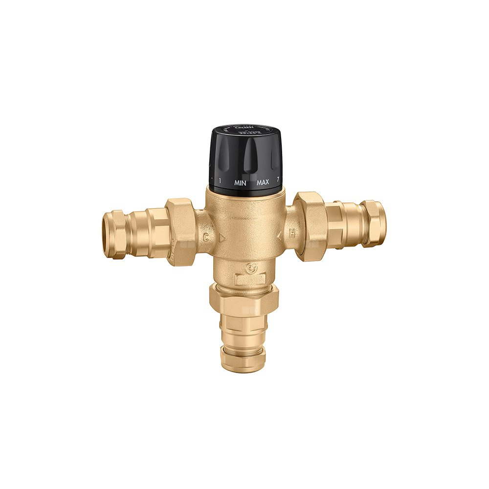 Regulowany termostatyczny zawór mieszający z wymiennym wkładem do systemów scentralizowanych Z zaworami zwrotnymi i złączkami zaciskowymi Przyłącze: Ø 28. Maksymalne ciśnienie pracy: 14 bar. Zakres regulacji temperatury: 35–65 °C. Maksymalna temperatura wlotowa: 90 °C. Kv: 7,6 m³/h. Materiał: stop mosiądzu odporny na odcynkowanie.