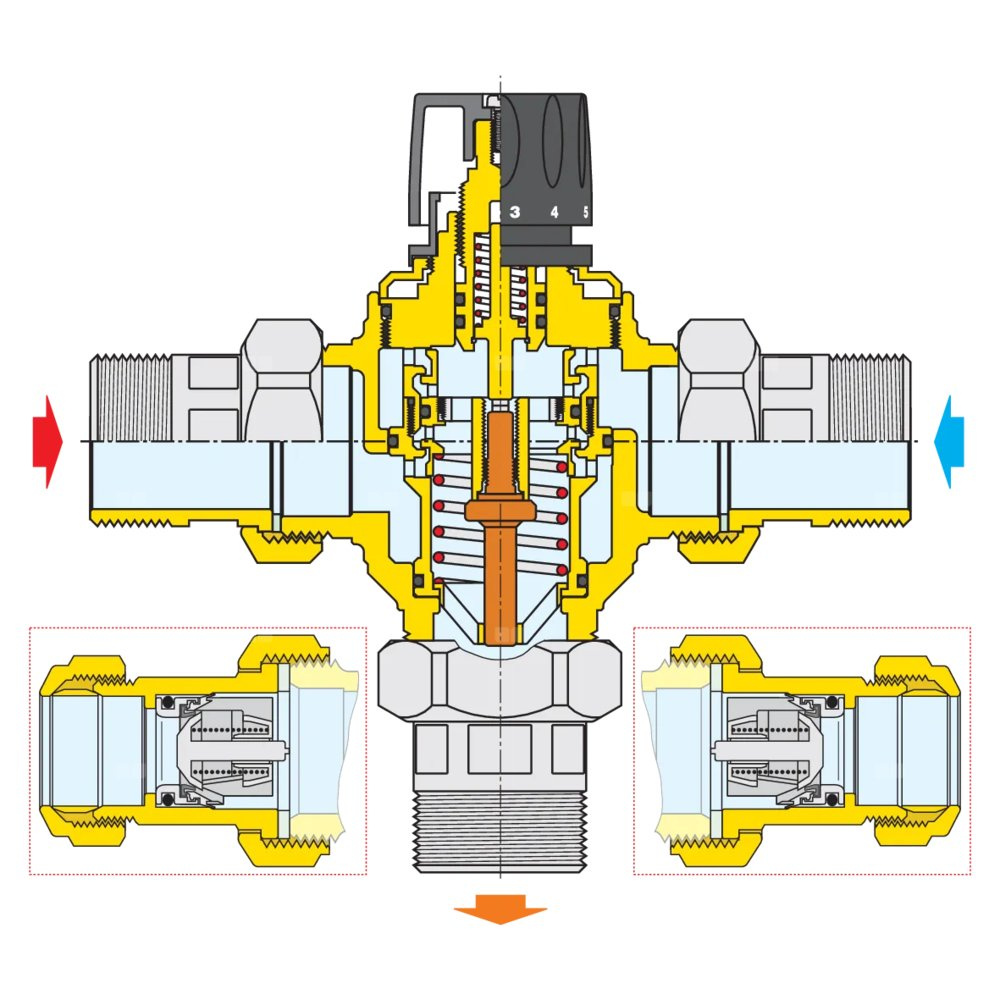 Regulowany termostatyczny zawór mieszający z wymiennym wkładem do systemów scentralizowanych. Z zaworami zwrotnymi 3/4"
