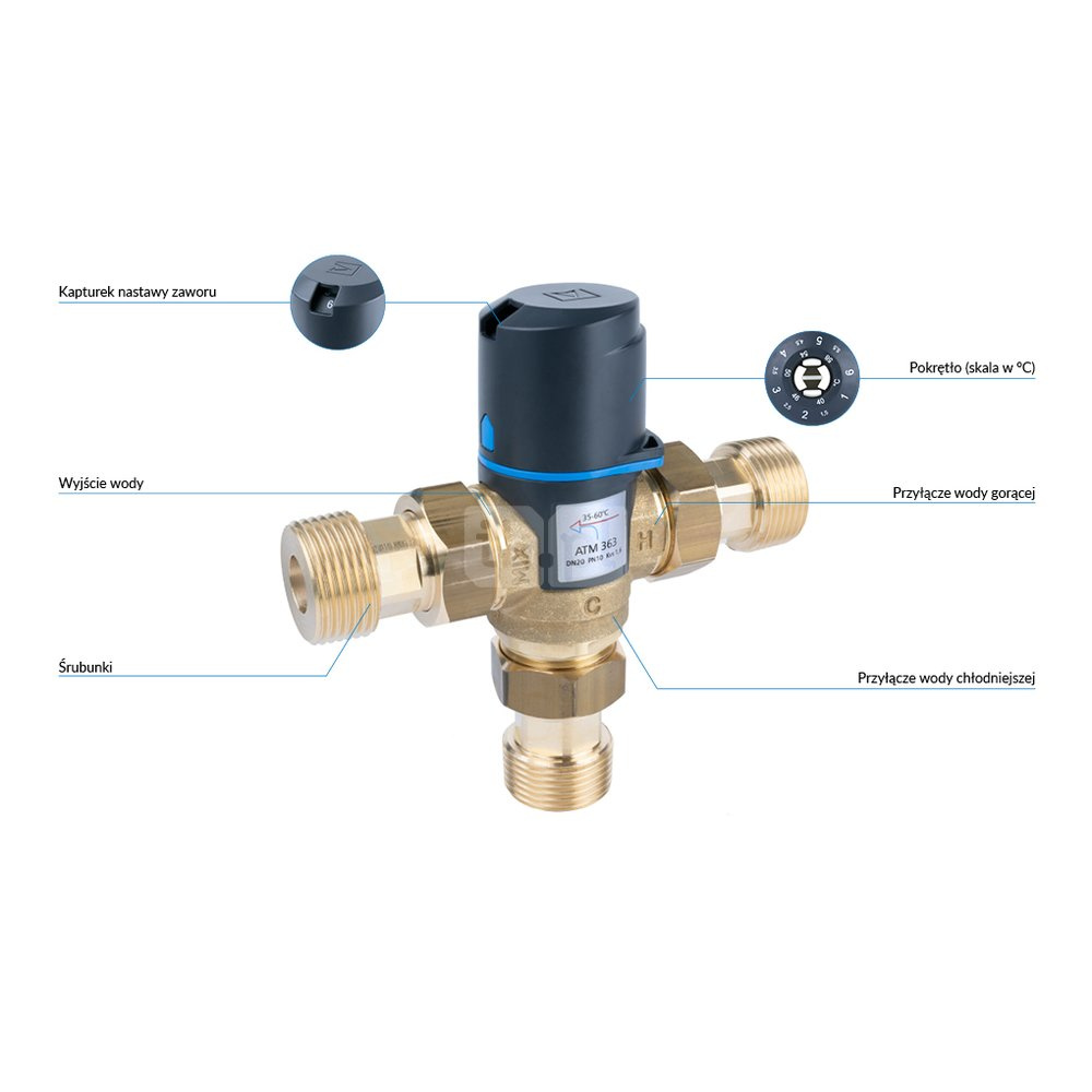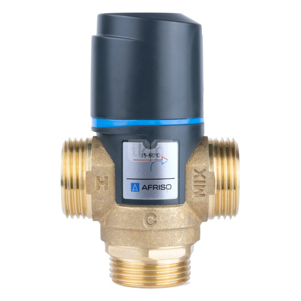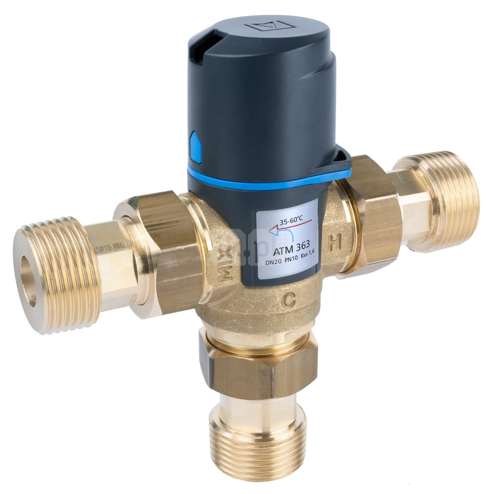 Zawór regulacyjny termostatyczny do wody ciepłej AFRISO ATM 363 ze śrubunkami mosiądz GZ 1'', DN 20, zakres temp. 35-60'C, Kvs 1.6 m3/h, maksymalna temperatura 90'C, maksymane ciśnienie 10 bar