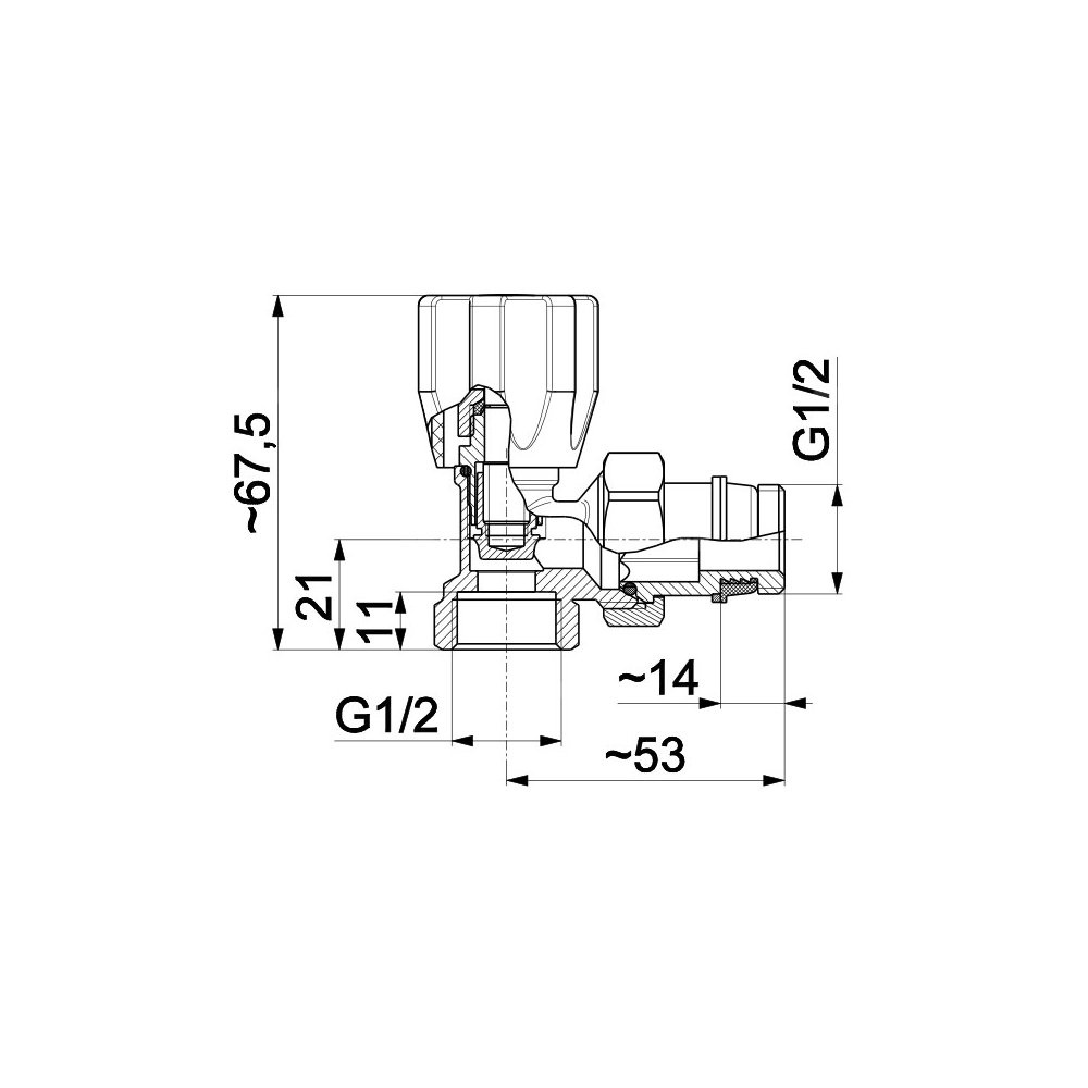 Zawór grzejnikowy, kątowy, mosiężny, z dławikiem.